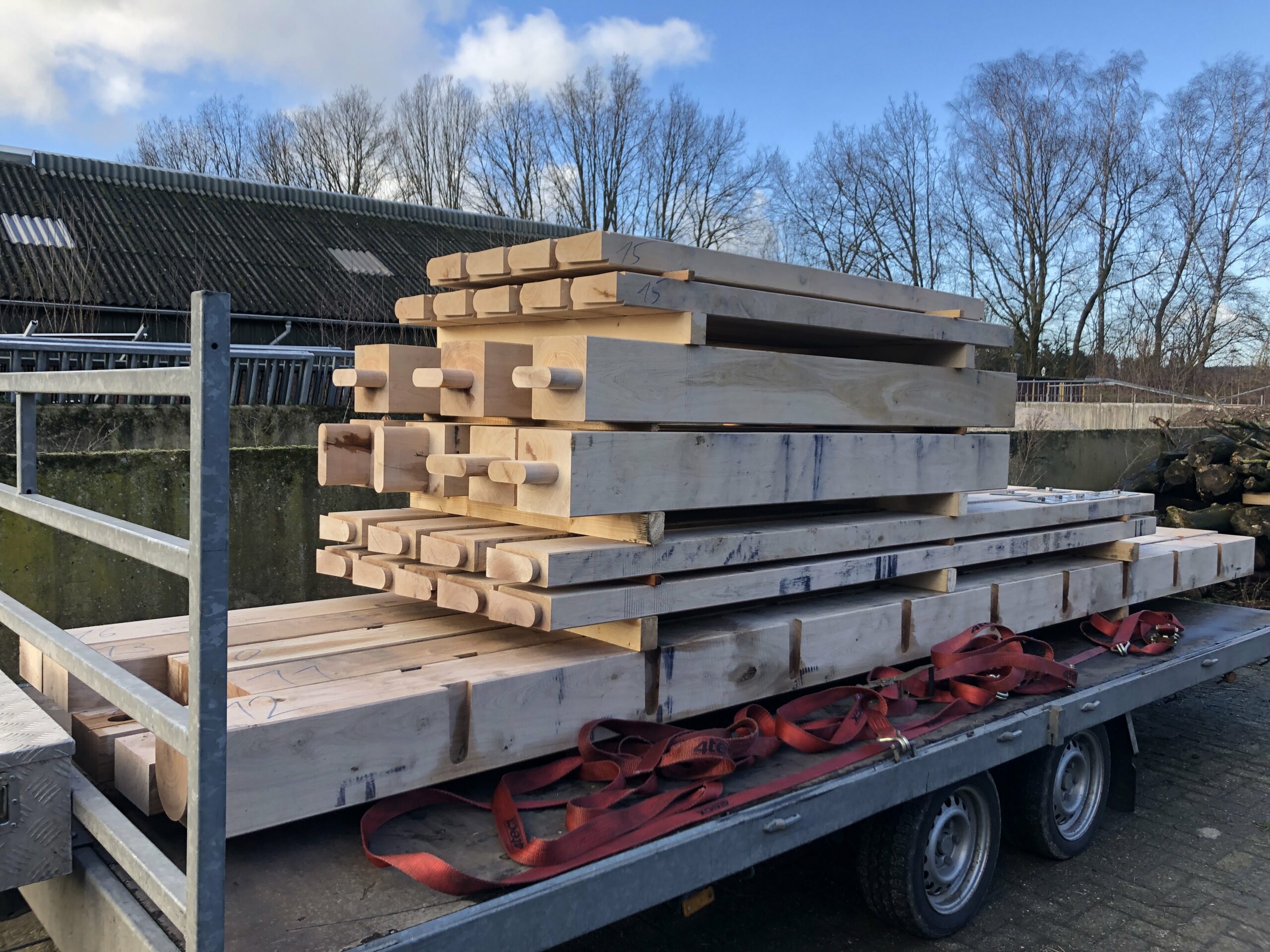 Met een moderne CNC-machine worden alle balken nauwkeurig op maat afgekort en voorzien van zwaluwstaarten, haaklassen en andere houtverbindingen die voor uw constructie nodig zijn.